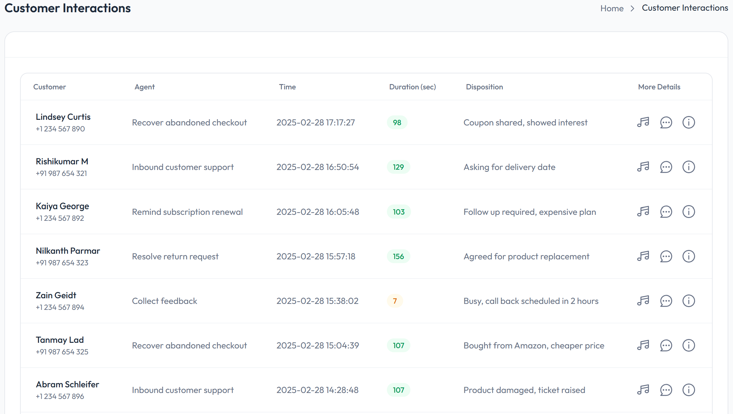 Skip to main contentThe Customer Interactions section logs all conversation history between customers and your voice agents.