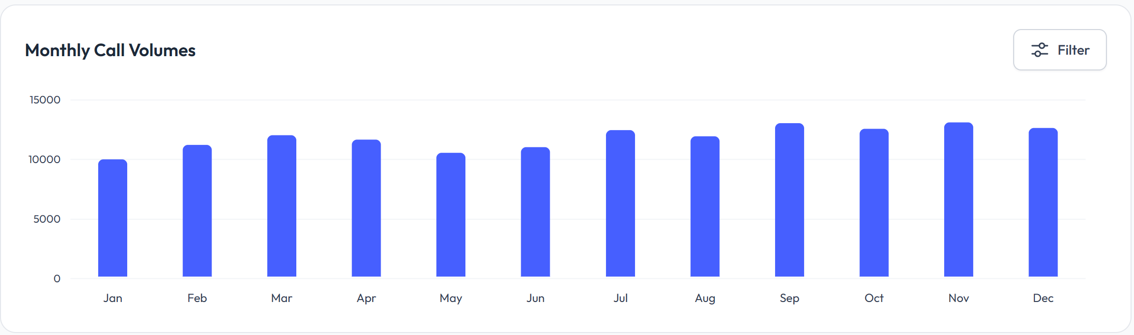 - Timeline view of Call Volumes (number of calls). Also allows filtering based on agent, call status, etc.
