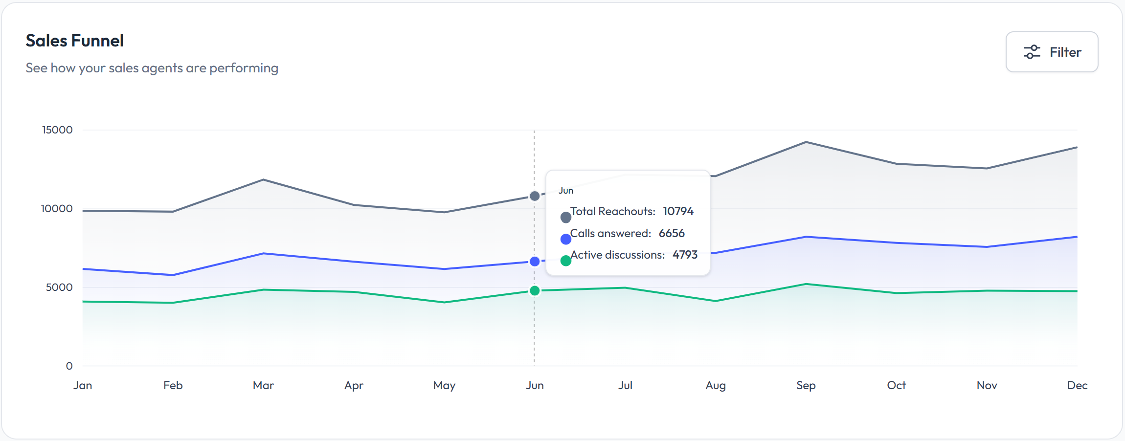 - Funnel view to see how your voice agents are performing. You can compare the efficiency across timelines as % calls answered and % active discussions. Also allows filtering based on agent, call status, etc.