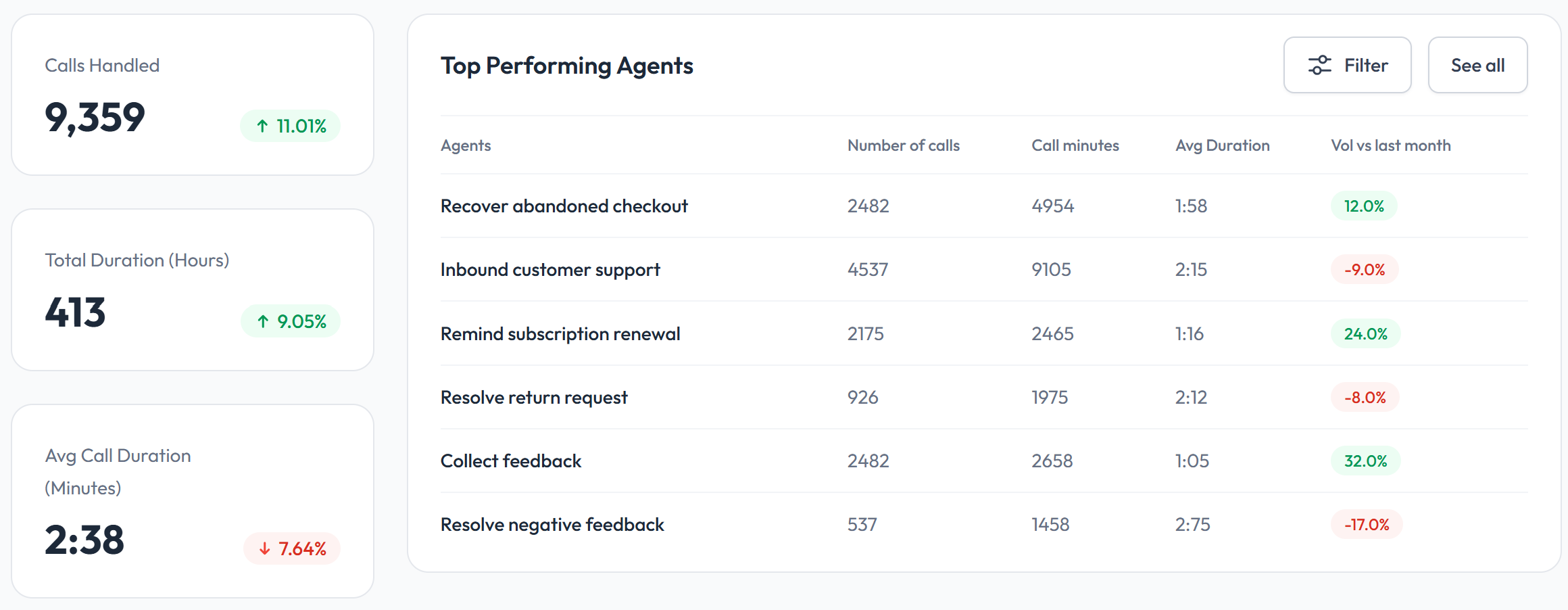 - Top Performing Agents section enables you to compare the performance of all your agents across multiple metrics.
